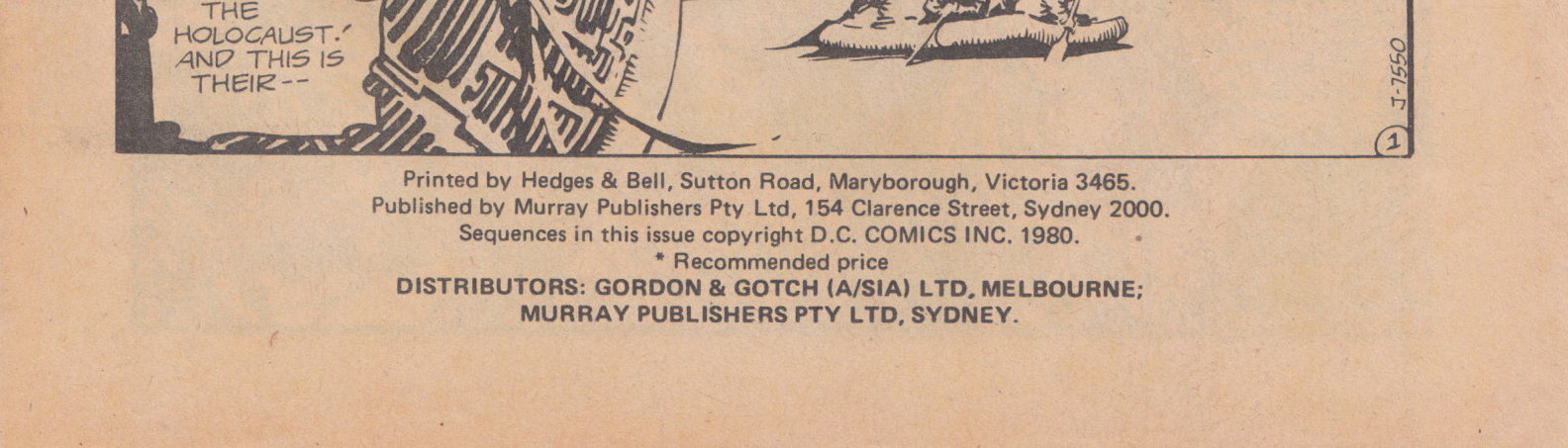 Printed by Hedges & Bell, Sutton Road, Maryborough, Victoria 3465. Published by Murray Publishers Pty Ltd, 154 Clarence Street, Sydney 2000. Sequences in the issue copyright D.C. Comics Inc. 1980. Distributors: Gordon & Gotch (A/sia) Ltd, Melbourne; Murray Publishers Pty Ltd, Sydney.