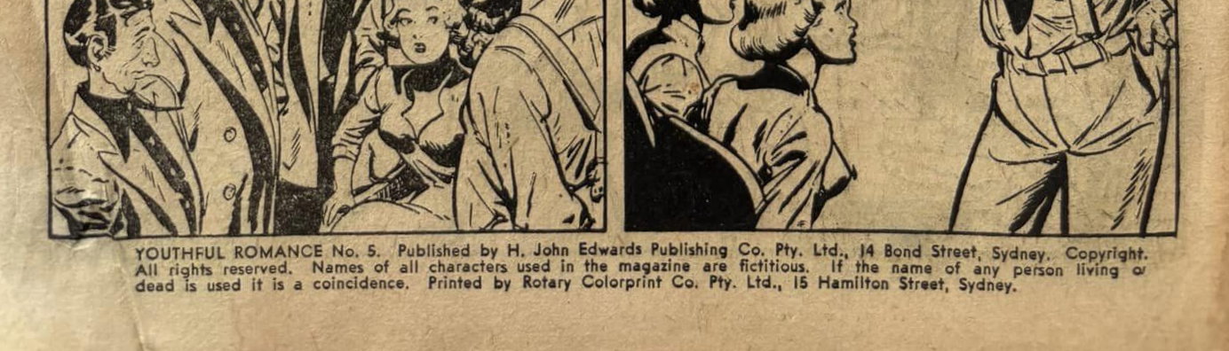 Youthful Romance No. 5. Published by H. John Edwards Publishing Co. Pty. Ltd., 14 Bond Street, Sydney. Copyright. All rights reserved. Names of all characters used in the magazine are fictitious. If the name of any person living or dead is used it is a coincidence. Printed by Rotary Colorprint Co. Pty. Ltd., 15 Hamilton Street, Sydney.