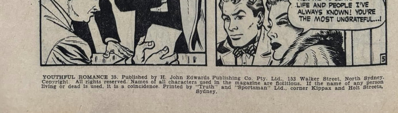 Youthful Romance 35. Published by H. John Edwards Publishing Co. Pty. Ltd., 153 Walker Street, North Sydney. Copyright. All rights reserved. Names of all characters used in the magazine are fictitious. If the name of any person living or dead is used, it is a coincidence. Printed by "Truth" and "Sportsman" Ltd., corner Kippax and Holt Streets, Sydney.