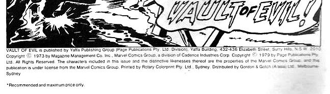 Vault of Evil is published by Yaffa Publishing Group (Page Publications Pty. Ltd. Division) Yaffa Building, 432-436 Elizabeth Street, Surry Hills, N.S.W. 2010. Copyright © 1973 by Magazine Management Co. Inc. Marvel Comics Group, a division of Cadence Industries Corp. Copyright © 1979 by Page Publications Pty. Ltd. All rights reserved. The characters included in this issue and the distinctive likenesses thereof are the properties of the Marvel Comics Group, and this publication is under licence from the Marvel Comics Group. Printed by Rotary Colorprint Pty. Ltd., Sydney. Distributed by Gordon & Gotch (A/asia) Ltd. Melbourne-Sydney.