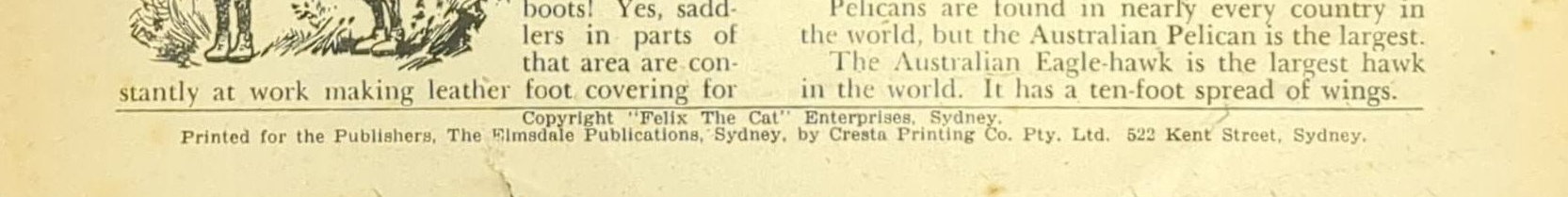 Copyright "Felix The Cat" Enterprises, Sydney. Printed for the Publishers, The Elmsdale Publications, Sydney, by Cresta Printing Co. Pty. Ltd., 522 Kent Street, Sydney.