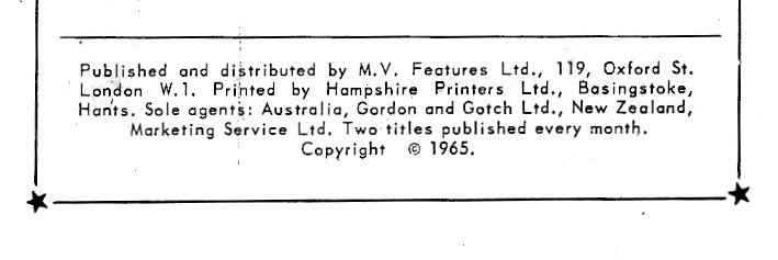 Published and distributed by M. V. Features Ltd., 119 Oxford St. London W.1. Printed by Hampshire Printers Ltd., Bosingstoke, Hants. Sole agents: Australia, Gordon and Gotch Ltd., New Zealand, Marketing Service Ltd. Two titles published every month. Copyright © 1965.