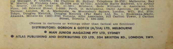 Printed by Kenmure Press Pty Ltd, Derby and Wetherill Sts, Nth Lidcombe, NSW, for Man Junior Magazine Pty Ltd, 142 Clarence St, sydney. Advertising: General Advertising Manager, P. Charell, 142 Clarence St, Sydney. Telephone 29-3761; Melbourne, Ray W. Martin, 36 Flinders Lane, 63-2294 and 63-7221; Adelaide Harry Hastwell, c/o Aurthur L. Searcy, 132-136 Gray St, 51-5911; Brisbane, Bede Williams & Associates, 5th Floor, 160 Edward Street, 2-6660; Perth, D. Schlipalius, Daryl Agencies, 150 Adelaide Terrace; London, H.A. Mackenzie, 4a Bloomsbury Square, London, WC1, Hol. 3779; Tokyo, douglas Kenrick (Far East) Ltd, No. 1, Enokizaka-Machi, Akasaka, minato-ku (582)-3705 toronto, Allin Associates, 915 Carlton Tower, 2 Carlton Street, Toronto 2, 634-2269. Distributors: Gordon & gotch (A/sia) Ltd, Melbourne. Man Junior Magazine Pty Ltd, Sydney. Atlas Publishing and Distributing Co Ltd, 334 Brixton Rd., London, SW9.