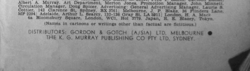 Printed by Kenmure Press Pty Ltd, Derby and Wetherill Sts, Nth Lidcombe, NSW, for Man Junior Magazine Pty Ltd, 142 Clarence St, Sydney. Publisher, Ken G. Murray. Editor, J. Semler. General Manager and Editor-in-chief, Fred T. Smith. Cartoon Editor, Albert A. Murray. Art Department, Merton Jones. Promotion Manager, John Minnett. Circulation manager, Doug Spicer. Advertising: General Advertising Manager, Laurie S. Cottier, 142 Clarence St, Sydney, BX 3761; Melbourne, J. P. Blake, 36 Flinders Lane MF 2294; Adelaide, Arthur L. Searcy, 132-136 Gray St, LA 5911; London, H. A. Mack 4a Bloomsbury Square, London, WC1, Hol 3779. Japan, R. E. Blazey, Tokyo. (Names in cartoons or writings other than factual are fictitious.) Distributors: Gordon & Gotch (A/sia) Ltd. Melbourne. The K. G. Murray Publishing Co Pty Ltd, Sydney.
