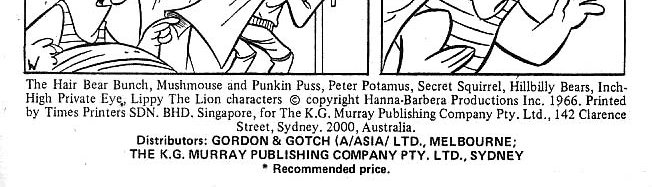 The Hair Bear Bunch, Mushmouse and Punkin Puss, Peter Potamus, Secret Squirrel, Hillbilly Bears, Inch-Hight Private Ey, Lippy the Lion characters © copyright Hanna-Barbera Productions Inc. 1966. Printed by Times Printers SDN. BHD. Singapore, for The K.G. Murray Publishing Company Pty. Ltd., 142 Clarence Street, Sydney, 2000, Australia. Distributors: Gordon & Gotch (A/asia/ [sic] Ltd., Melbourne; The K.G. Murray Publishing Company Pty. Ltd., Sydney.