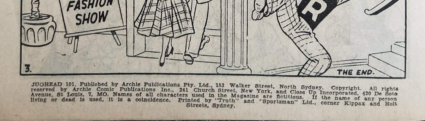 Jughead 101. Published by Archie Publications Pty. Ltd., 153 Walker Street, North Sydney. Copyright. All rights reserved by Archie Comic Publications Inc., 241 Church Street, New York, and Close Up Incorporated, 420 De Soto Avenue, St Louis, 7, MO. Names of all characters used in the magazine are fictitious. If the name of any person living or dead is used, it is a coincidence. Printed by "Truth" and "Sportsman" Ltd., corner Kippax and Holt Streets, Sydney.