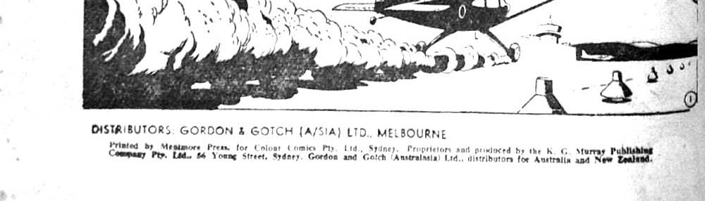 Distributors: Gordon & Gotch (A/sia) Ltd., Melbourne. Printed by Mentmore Press, for Colour Comics Pty. Ltd., Sydney. Proprietors and produced by the K. G. Murray Publishing Company Pty. Ltd., 56 Young Street, Sydney. Gordon and Gotch (Australasia) Ltd., distributors for Australia and New Zealand.