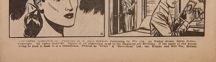 Youthful Romances #44—Published by H. John Edwards Publishing Co. Pty. Ltd., 153 Walker Street, North Sydney. Copyright. All rights reserved. Names of all characters used in the magazine are fictitious. If the name of any person living or dead is used, it is a coincidence. Printed by "Truth" & "Sportsman" Ltd., cnr. Kippax and Holt Sts., Sydney.