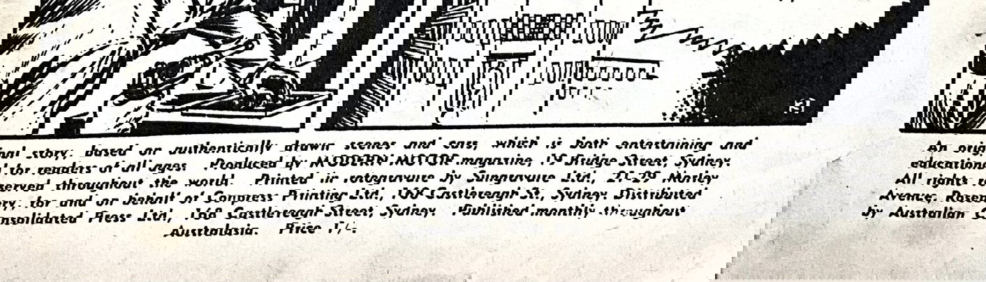 An original story, based on authentically drawn scenes and cars, which is both entertaining and educational for readers of all ages. Produced by Modern Motor magazine, 19 Bridge Street, Sydney. All rights reserved throughout the world. Printed in rotogravure by Sungravure Ltd., 21-29 Moreley Avenue, Rosebery, for and on behalf of Conpress Printing Ltd., 168 Castlereagh St., Sydney. Distributed by Australian Consolidated Press Ltd., 168 Castlereagh Street, Sydney. Published monthly throughout Australasia. Price 1/-.