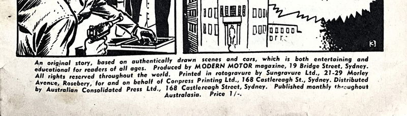An original story, based on authentically drawn scenes and cars, which is both entertaining and educational for readers of all ages. Produced by Modern Motor magazine, 19 Bridge Street, Sydney. All rights reserved throughout the world. Printed in rotogravure by Sungravure Ltd., 21-29 Moreley Avenue, Rosebery, for and on behalf of Conpress Printing Ltd., 168 Castlereagh St., Sydney. Distributed by Australian Consolidated Press Ltd., 168 Castlereagh Street, Sydney. Published monthly throughout Australasia. Price 1/-.