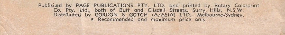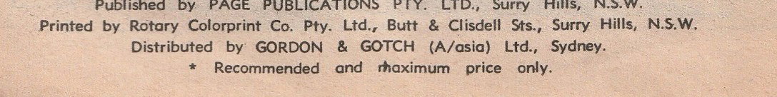 Published by Page Publications Pty. Ltd. And printed by Rotary Colorprint Co. pty. Ltd., both of Butt and Clisdell Streets, Surry Hills, N.S.W. Distributed by Gordon & Gotch (A/asia) Ltd., Melbourne-Sydney.