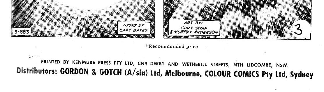 Printed by Kenmure Press Pty Ltd, Cnr Derby and Wetherill Streets, Nth Lidcombe, NSW, for the proprietors Colour Comics Pty Ltd, Sydney and produced by the K. G. Murray Publishing Company Pty Ltd, 142 Clarence Street, Sydney. Gordon & Gotch (A/sia) Ltd, distributors for Australia and New Zealand. Sequences in this issue Copyright National Periodical Publications Inc.