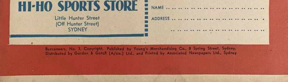 Buccaneers, No. 3, Copyright. Published by Young's Merchandising Co., 8 Spring Street, Sydney. Distributed by Gordon & Gotch (A/sia.) Ltd., and Printed by Associated Newspapers Ltd., Sydney.