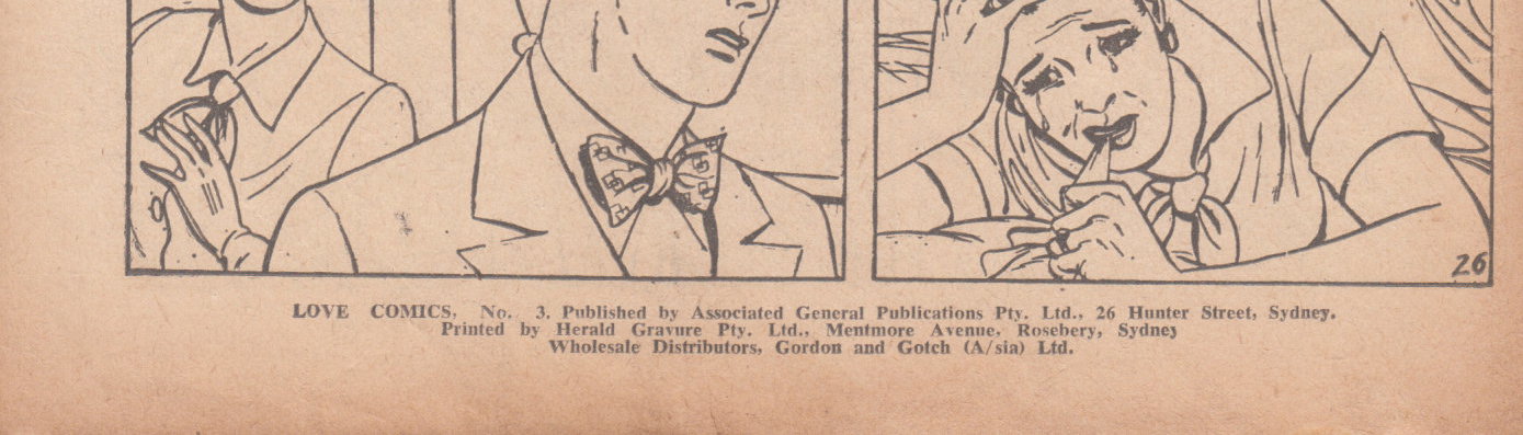 Love Comics, No. 3. Published by Associated General Publications Pty. Ltd., 26 Hunter Street, Sydney. Printed by Herald Gravure Pty. Ltd., Mentmore Avenue, Rosebery, Sydney. Wholesale Distributors, Gordon and Gotch (A/sia) Ltd.