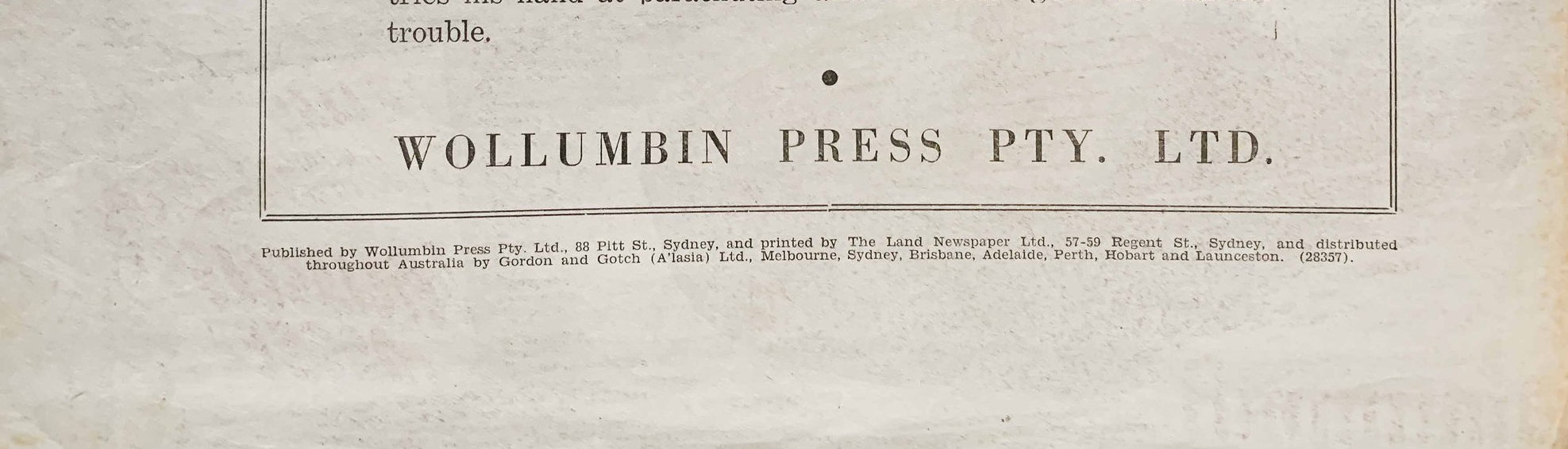 Published by Wollumbin Press Pty. Ltd., 88 Pitt St., Sydney, and printed by The Land Newspaper Ltd., 57-59 Regent St., Sydney, and distributed throughout Australia by Gordon and Gotch (A'lasia) Ltd., Melbourne, Sydney, Brisbane, Adelaide, Perth, Hobart and Launceston. (28357)