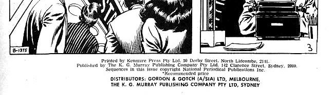 Printed by Kenmure Press Pty Ltd, 50 Derby Street, North Lidcombe, 2141. Published by The K. G. Murray Publishing Company Pty Ltd, 142 Clarence Street, Sydney, 2000. Sequences in this issue Copyright National Periodical Publications Inc. Distributors: Gordon & Gotch (A/sia) Ltd, Melbourne, The K. G. Murray Publishing Company Pty Ltd, Sydney.