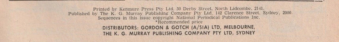 Printed by Kenmure Press Pty Ltd, 50 Derby Street, North Lidcombe, 2141. Published by the K. G. Murray Publishing Company Pty Ltd, 142 Clarence Street, Sydney, 2000. Sequences in this issue Copyright National Periodical Publications Inc. Distributors: Gordon & Gotch (A/sia) Ltd, Melbourne, The K. G. Murray Publishing Company Pty Ltd, Sydney.