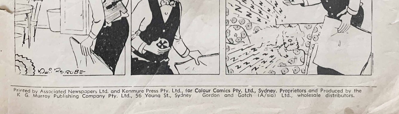 Printed by Associated Newspapers Ltd. And Kenmure Press Pty. Ltd., for Colour Comics Pty. Ltd., Sydney. Proprietors and Produces by the K. G. Murray Publishing Company Pty. Ltd., 56 Young St., Sydney. Gordon and Gotch (A/sia) Ltd., wholesale distributors.