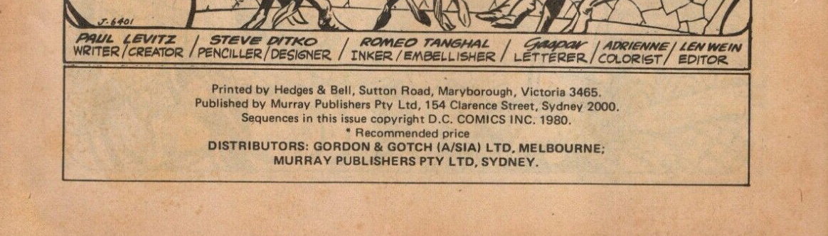 Printed by Hedges & Bell, Sutton Road, Maryborough, Victoria 3465. Published by Murray Publishers Pty Ltd, 154 Clarence Street, Sydney 2000. Sequences in this issue copyright D.C. Comics Inc. 1980. Distributors: Gordon & Gotch (A/sia) Ltd, Melbourne; Murray Publishers Pty Ltd, Sydney.