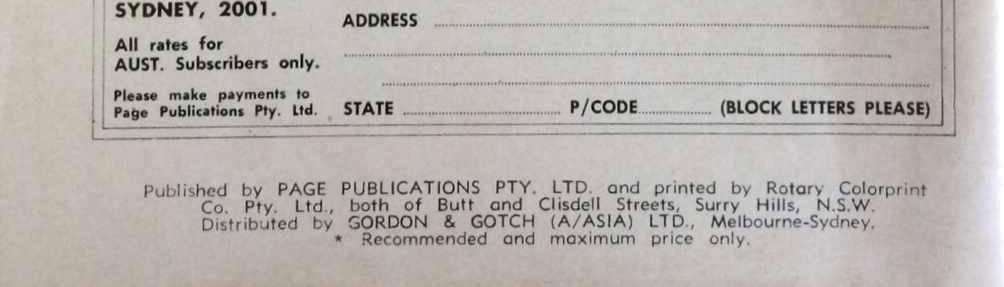 Published by Page Publications Pty. Ltd., and printed by Rotary Colorprint Co. Pty. Ltd., both of Butt and Clisdell Streets, Surry Hills, N.S.W. Distributed by Gordon & Gotch (A/asia) Ltd., Melbourne-Sydney.