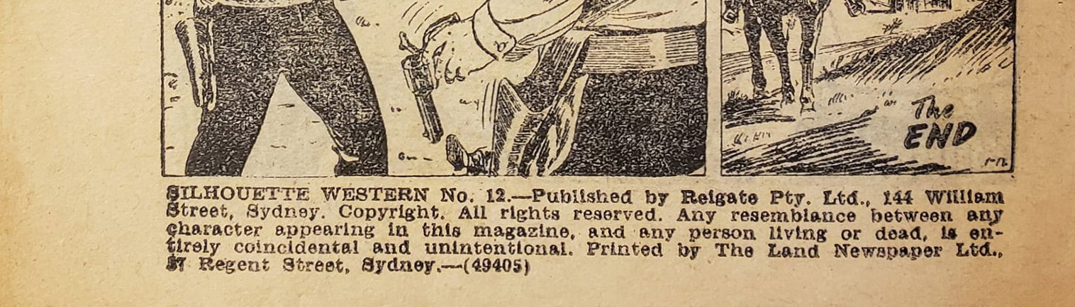 Silhouette Western No. 12.--Published by Reigate Pty. Ltd., 144 William Street, Sydney. Copyright. All rights reserved. Any resemblance between any character appearing in this magazine, and any person living or dead, is entirely coincidental and unintentional. Printed by The Land Newspaper Ltd., 57 Regent Street, Sydney.-- (49405) Distributed by Atlas Publishing and distributing Company Limited, London; Gordon and Gotch (A'sia) Limited, Melbourne; Marketing Services (N.Z.) Ltd., New Zealand.