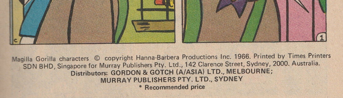 Magilla Gorilla characters © copyright Hanna-Barbera Productions Inc. 1966. Printed by Times Printers SDN 8HD. Singapore for Murray Publishers Pty. Ltd., 142 Clarence Street, Sydney, 2000. Australia. Distributors: Gordon & gotch (A/asia) Ltd., Melbourne; Murray Publishers Pty. Ltd., Sydney.