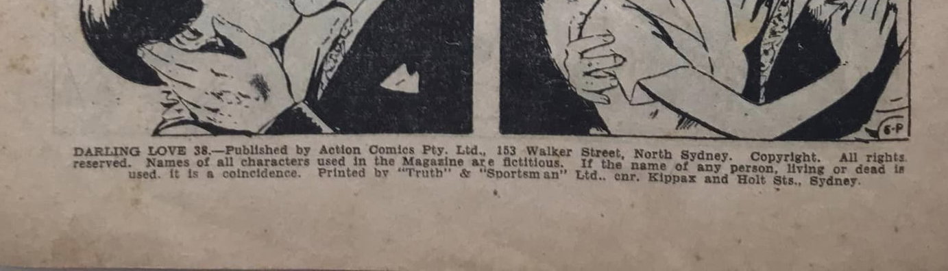 Darling Love 38.--Published by Action Comics Pty. Ltd., 153 Walker Street, North Sydney. Copyright. All rights reserved. Names of all characters used in the magazine are fictitious. If the name of any person, living or dead is used, it is a coincidence. Printed by "Truth" & "Sportsman" Ltd., cnr. Kippax and Holt Sts., Sydney.