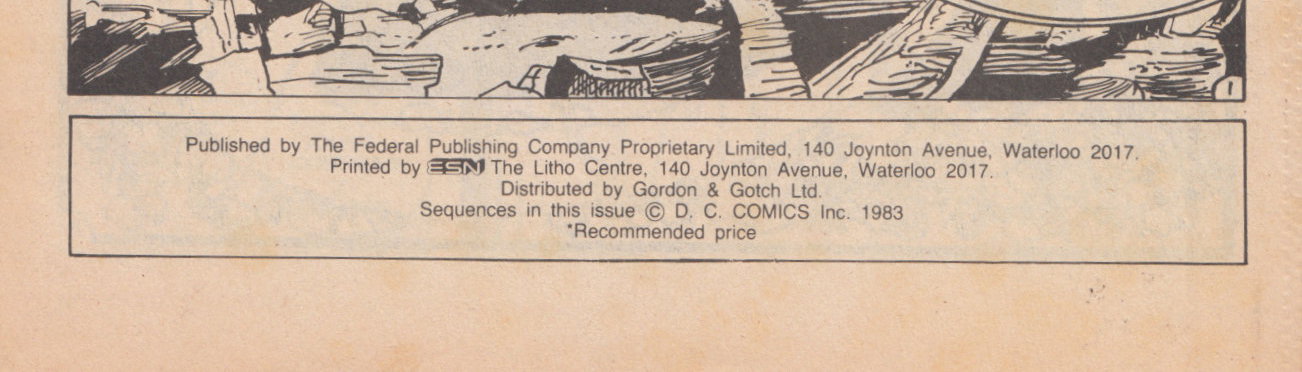 Published by The Federal Publishing Company Proprietary Limited, 140 Joynton Avenue, Waterloo 2017. Printed by ESN The Litho Centre, 140 Joynton Avenue, Waterloo 2017. Distributed by Gordon & Gotch Ltd. Sequences in this issue © D. C. Comics Inc. 1983.