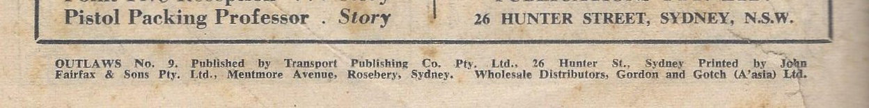 Outlaws No. 9. Published by Transport Publishing Co. Pty. Ltd., 26 Hunter St., Sydney. Printed by John Fairfax & Sons Pty. Ltd., Mentmore Avenue, Rosebery, Sydney. Wholesale Distributors, Gordon and Gotch (A'asia) Ltd.