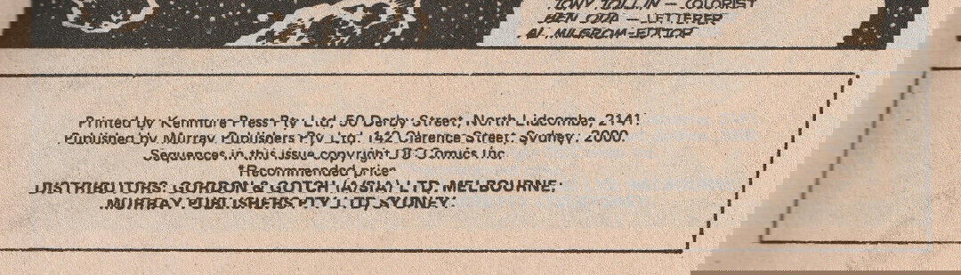 Printed by Kenmure Press Pty Ltd, 50 Derby Street, North Lidcombe, 2141. Published by Murray Publishers Pty Ltd, 142 Clarence Street, Sydney, 2000. Sequences in this issue copyright DC Comics Inc. Distributors: Gordon & Gotch (A/sia) Ltd, Melbourne; Murray Publishers Pty Ltd, Sydney.