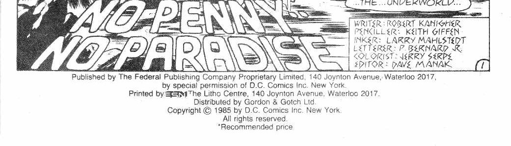 Published by The Federal Publishing Company Proprietary Limited, 140 Joynton Avenue, Waterloo 2017, by special permission of D.C. Comics Inc. New York. Printed by ESN The Litho Centre, 140 Joynton Avenue, Waterloo 2017. Distributed by Gordon & Gotch Ltd. Copyright © 1985 by D. C. Comics Inc. New York. All rights reserved.