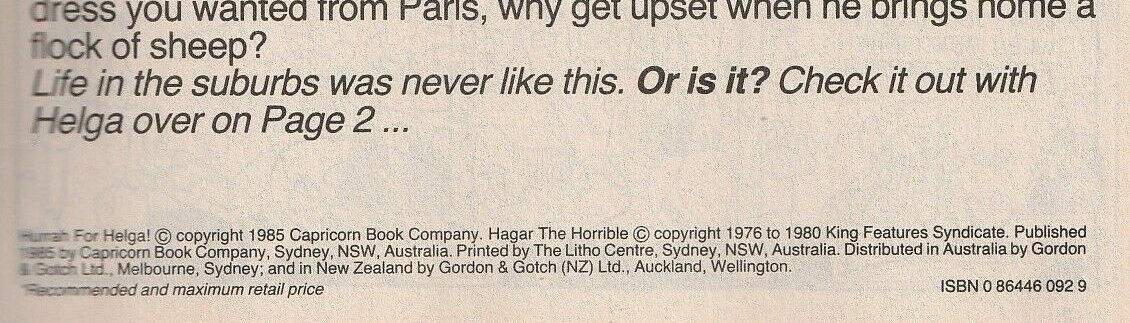 Hurrah For Helga! © copyright 1985 Capricorn Book Company. Hagar The Horrible © copyright 1976 to 1980 King Features Syndicate. Published 1985 by Capricorn Book Company, Sydney, NSW, Australia. Printed by The Litho Centre, Sydney, NSW, Australia. Distributed in Australia by Gordon & Gotch Ltd., Melbourne, Sydney; and in New Zealand by Gordon & Gotch (NZ) Ltd., Auckland, Wellington.