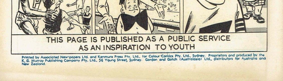 Printed by Associated Newspapers Ltd. and Kenmure Press Pty. Ltd. For Colour Comics Pty. Ltd., Sydney. Proprietors and produced by the K. G. Murray Publishing Company Pty. Ltd., 56 Young Street, Sydney. Gordon and Gotch (Australasia) Ltd., distributors for Australia and New Zealand.