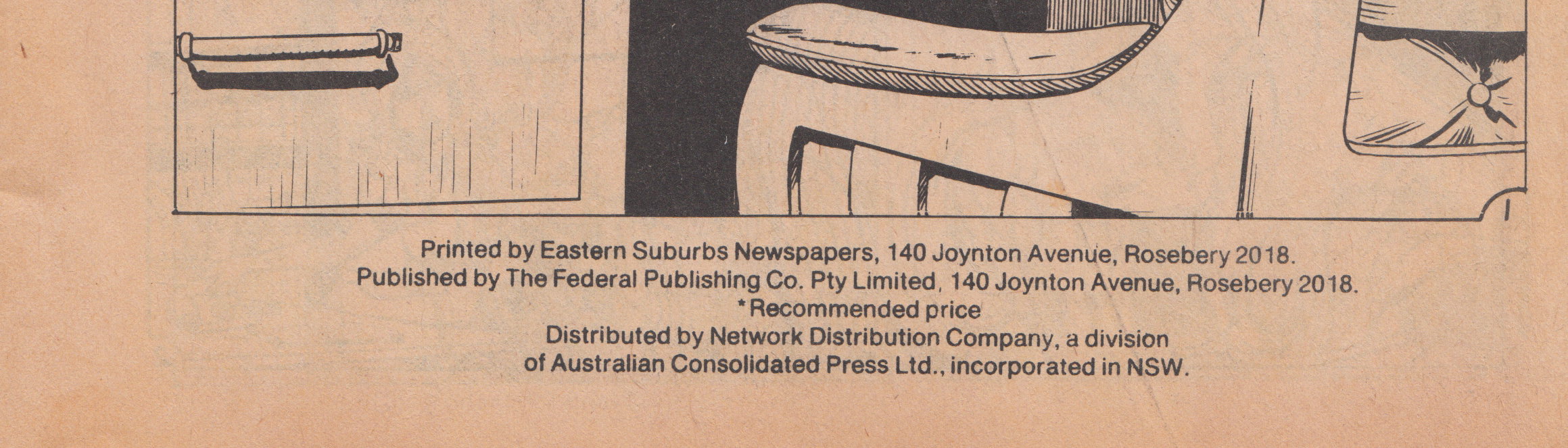 Printed by Eastern Suburbs Newspapers, 140 Joynton Avenue, Rosebery 2018. Published by The Federal Publishing Co. Pty Limited, 140 Joynton Avenue, Rosebry 2018. Distributed by Network Distribution Company, a division of Australian Consolidated Press Ltd., incorporated in NSW.