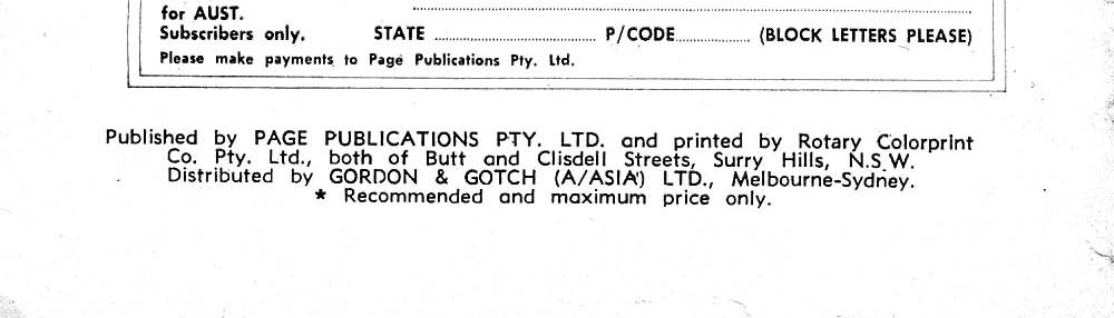 Published by Page Publications Pty. Ltd. And printed by Rotary Colorprint Co. Pty. Ltd., both of Butt and Clisdell Street, Surry Hills, N.S.W. Distributed by Gordon & Gotch (A/asia) Ltd., Melbourne-Sydney.