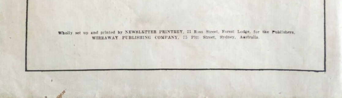 Wholly set up and printed by Newsletter Printery, 21 Ross Street, Forest Lodge for the publishers Wirraway Publishing Company, 75 Pitt Street, Sydney, Australia.