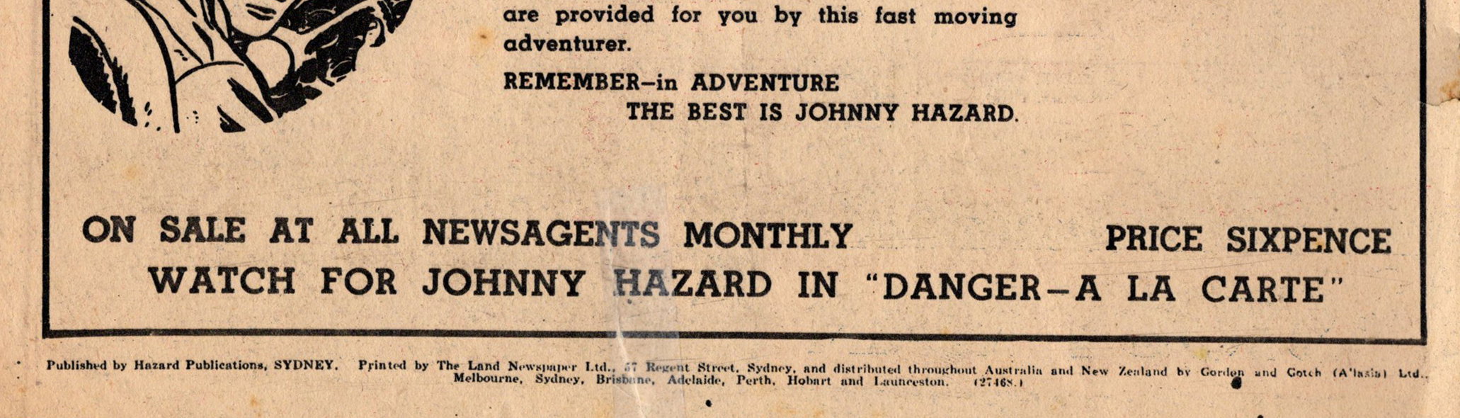 Published by Hazard Publications, Sydney. Printed by The Land Newspaper Ltd., 57 Regent Street, Sydney, and distributed throughout Australia and New Zealand by Gordon and Gotch (A'lasia) Ltd., Melbourne, Sydney, Brisbane, Adelaide, Perth, Hobart and Launceston. (27468.)