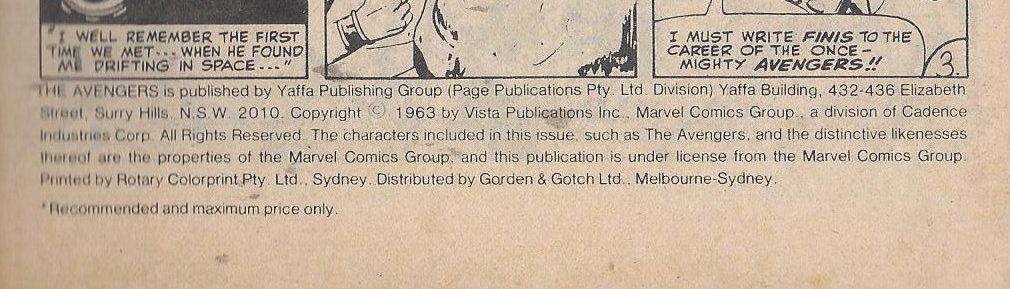 The Avengers is published by Yaffa Publishing Group (Page Publications Pty. Ltd. Division) Yaffa Building, 432-436 Elizabeth Street, Surry Hills, N.S.W. 2010. Copyright © 1963 by Vista Publications Inc., Marvel Comics Group, a division of Cadence Industries Corp. All rights reserved. The characters included in this issue, such as The Avengers, and the distinctive likenesses thereof are the properties of the Marvel Comics Group, and this publication is under license from the Marvel Comics Group. Printed by Rotary Colorprint Pty. Ltd., Sydney. Distributed by Gordon & Gotch Ltd., Melbourne-Sydney.