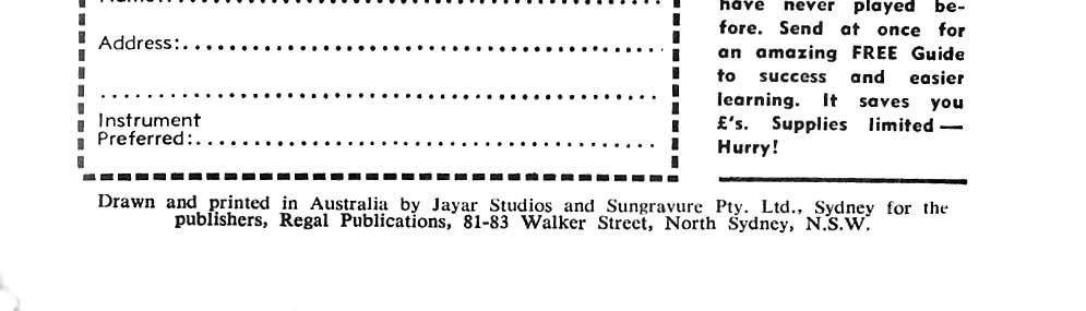 Drawn and printed in Australia by Jayar Studios and Sungravure Pty. Ltd., Sydney for the publishers, Regal Publications, 81-83 Walker Street, North Sydney, N.S.W.Distributed by Gordon & Gotch (A/sia) Ltd., Melbourne. All names used throughout are fictitious and do not refer to any person, living or dead.