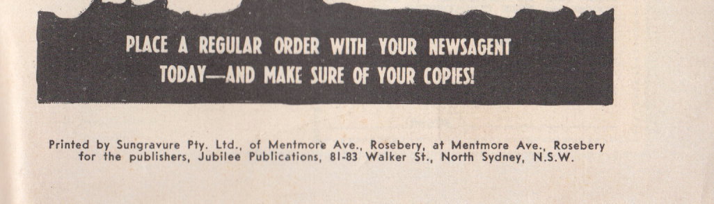 Printed by Sungravure Pty. Ltd., of Mentmore Ave., Rosebery, at Mentmore Ave., Rosebery for the publishers, Jubilee Publications, 81-83 Walker St., North Sydney, N.S.W.