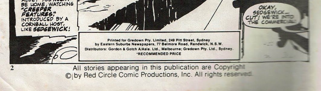 Printed for Gredown Pty. Limited, 240 Pitt Street, Sydney by Eastern Suburbs Newspapers, 77 Belmore road, Randwick, N.S.W. Distributors: Gordon & Gotch A/Asia, Ltd., Melbourne; Gredown Py. Ltd., Sydney. All stories appering in this publication are Copyright © by Red Circle Comic Productions, Inc. All rights reserved.