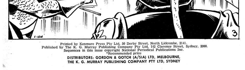 Printed by Kenmure Press Pty Ltd, 50 Derby Street, North Lidcombe, 2141. Published by The K. G. Murray Publishing Company Pty Ltd, 142 Clarence Street, Sydney, 2000. Sequences in this issue copyright National Periodical Publications Inc. Distributors: Gordon & Gotch (A/sia) Ltd, Melbourne, The K. G. Murray Publishing Company Pty Ltd, Sydney.