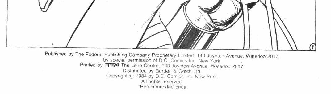 Published by The Federal Publishing Company Proprietary Limited, 140 Joynton Avenue, Waterloo 2017, by special permission of D. C. Comics Inc. New York. Printed by ESN The Litho Centre, 140 Joynton Avenue, Waterloo 2017. Distributed by Gordon & Gotch Ltd. Copyright (c) 1984 by D. C. Comics Inc. New York. All rights reserved.